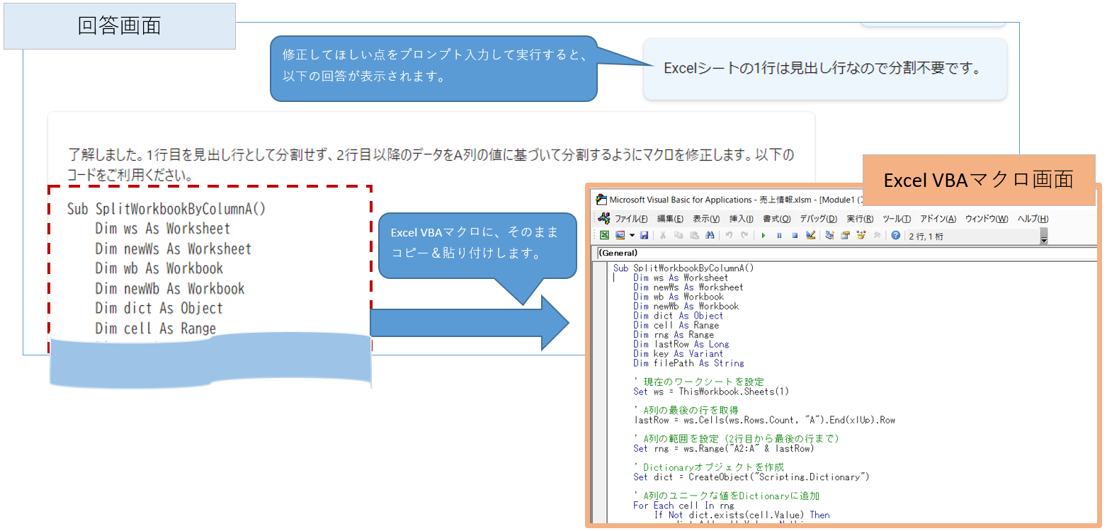 再回答で得たプログラムをマクロにコピー&貼り付けし、再度動作確認を行ないます。